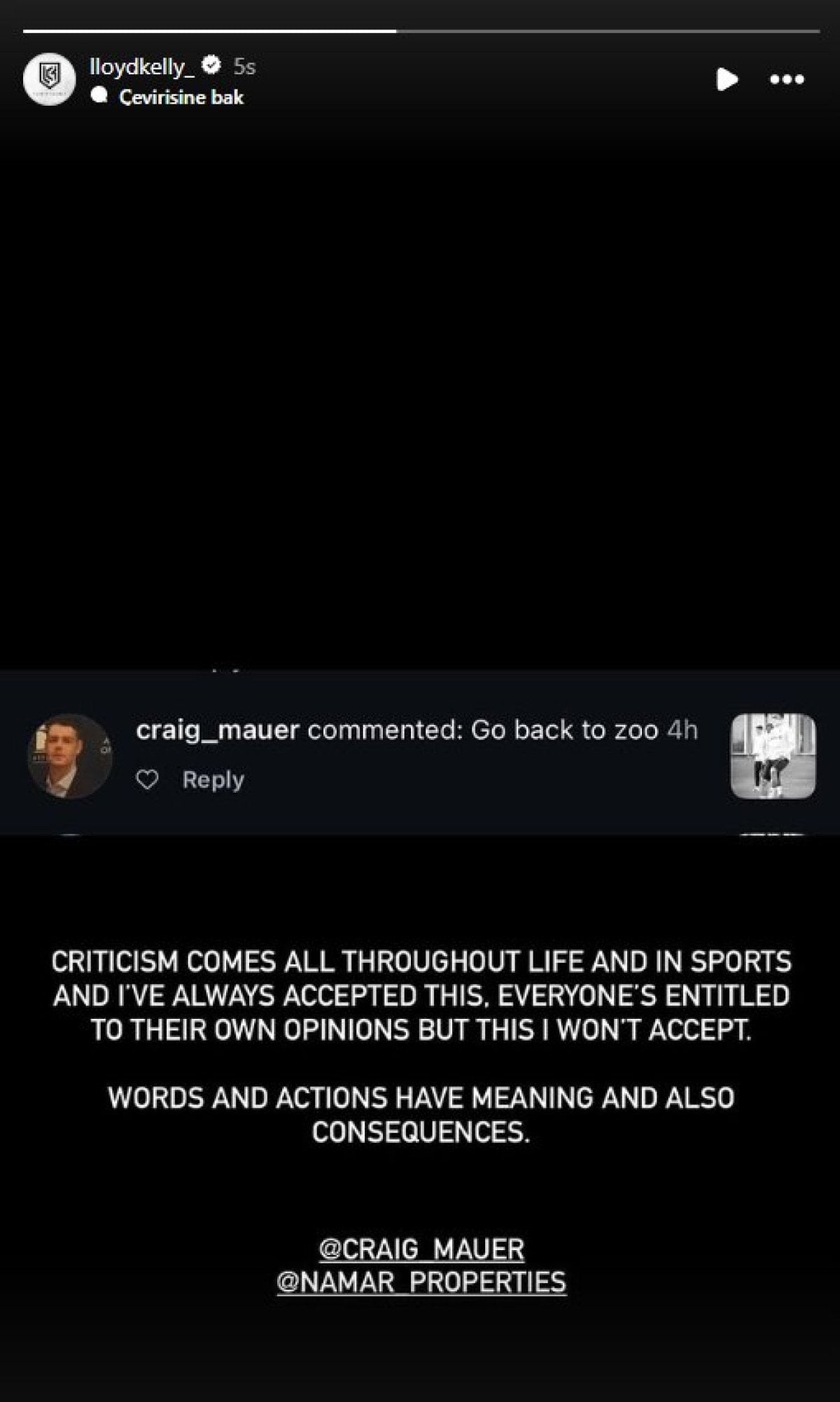 İngiliz savunma oyuncusu, sosyal medya platformu Instagram’daki hesabında bulunan bir fotoğrafının altına, kullanıcılardan birinin “Hayvanat bahçesine geri dön” yönündeki ifadenin ekran görüntüsünü paylaştı.