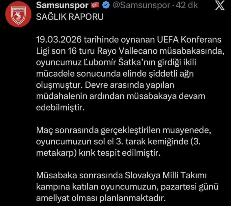 Müsabakanın ardından Slovakya Milli Takımı kampına katılan Lubomir Satka’nın, pazartesi günü ameliyat edilmesinin planlandığı bildirildi.