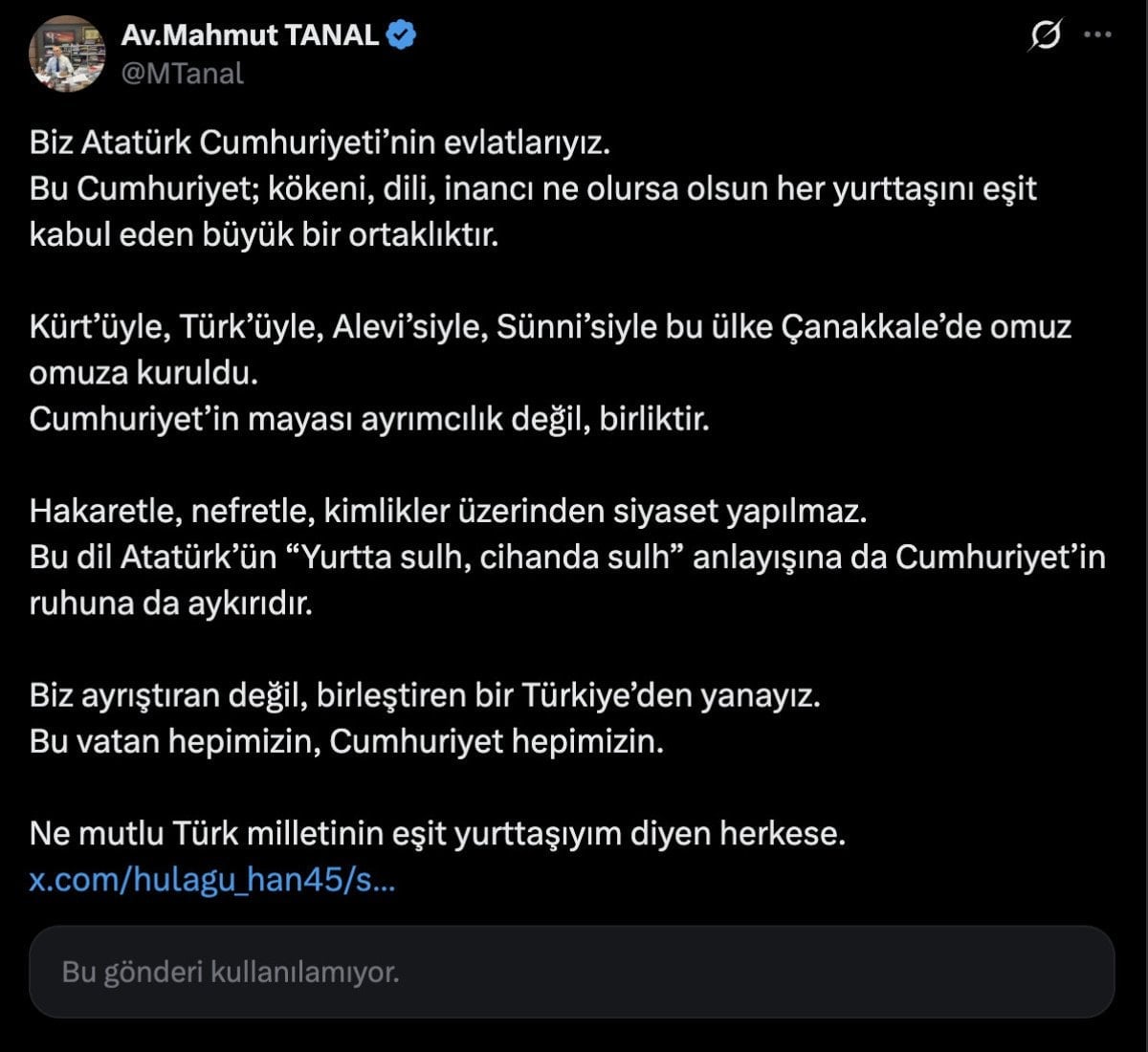 Alıntıladığı bir X paylaşımında Türkiye’deki etnik çeşitliliğe ve bir arada yaşama pratiğine dikkat çeken Tanal, Atatürk’ün ‘Ne mutlu Türk’üm diyene’ sözünü ‘Ne mutlu Türk milletinin eşit yurttaşıyım diyen herkese’ şeklinde kullanınca ortalık karıştı.