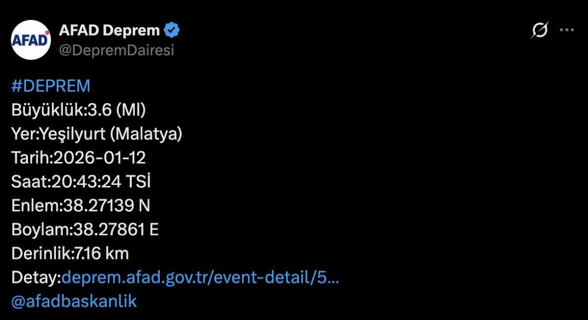 Afet ve Acil Durum Yönetimi Başkanlığı (AFAD) verilerine göre, Malatya’nın Yeşilyurt ilçesinde 3.6 büyüklüğünde deprem meydana geldi.