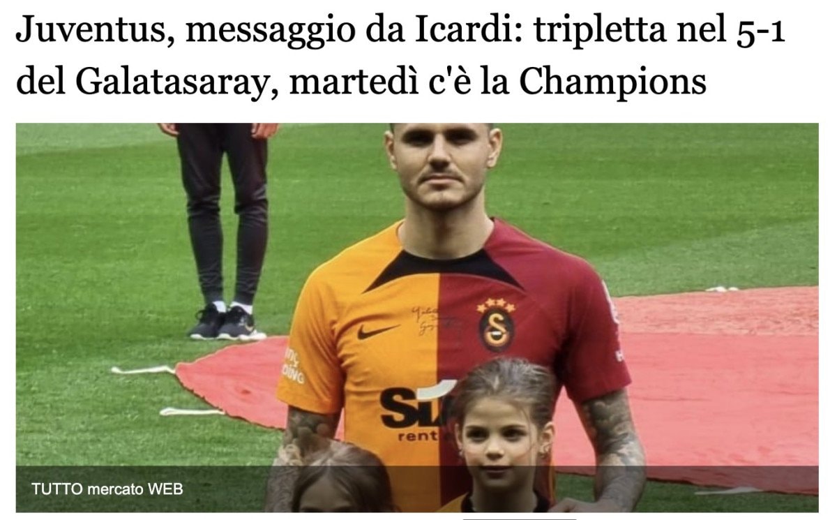 “Galatasaray, Şampiyonlar Ligi play-off’ları öncesinde Juventus’a bir mesaj daha gönderdi . Avrupa’da son 16 turu için iki ayaklı eleme maçlarında Juventus’un rakibi olacak Türk ekibi, Türkiye Süper Ligi 22. haftasında Eyüpspor’u 5-1’lik skorla mağlup etti. Ocak transfer döneminde Juventus ile adı anılan Mauro Icardi, hat-trick yaparak kilit rol oynadı.”
