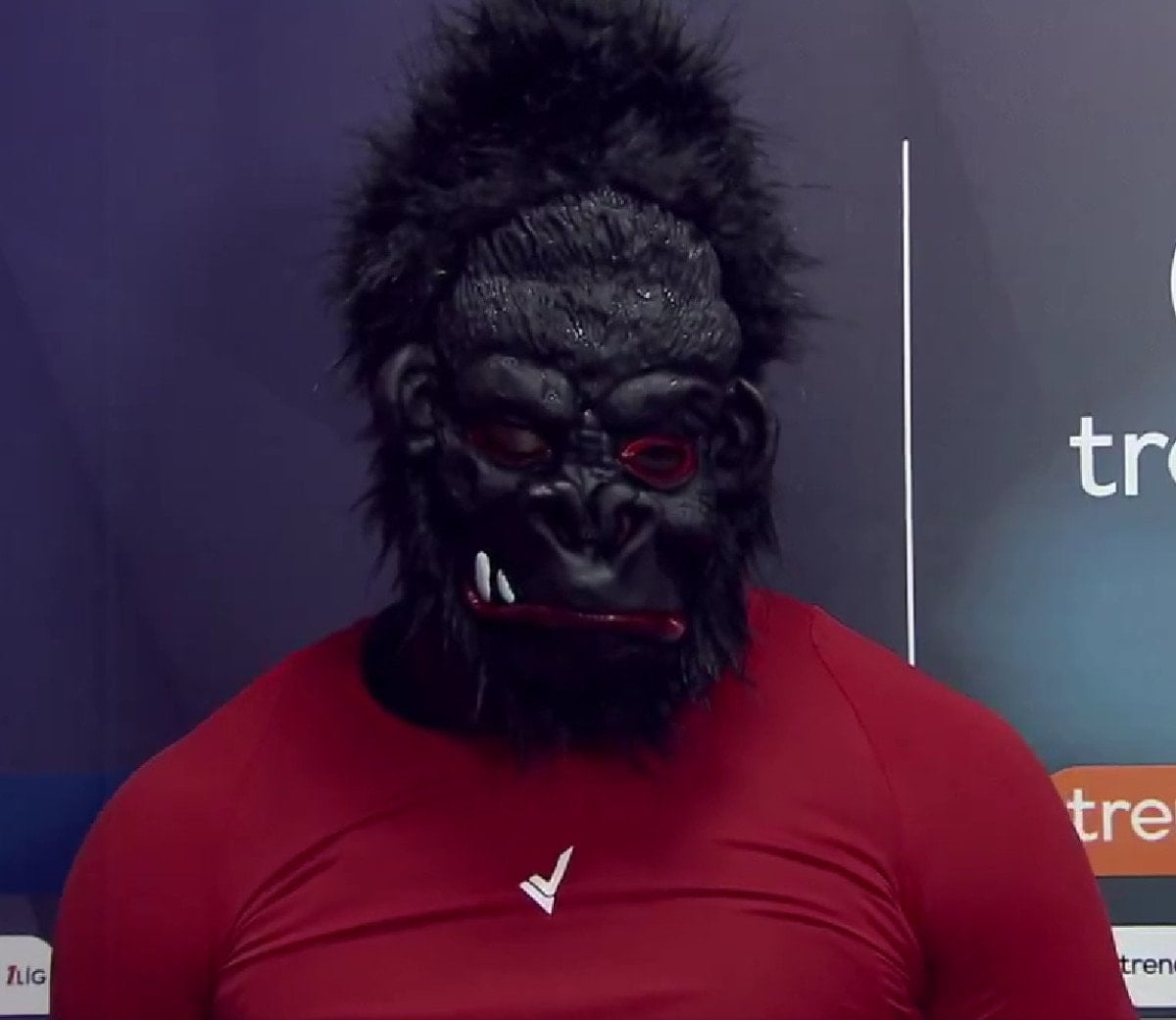 Amed Sportif Faaliyetler forması giyen Senegalli golcü Mbaye Diagne Çorum FK karılaşmasının ardından yayıncı kuruluş röportajına King Kong maskesi ile çıktı.