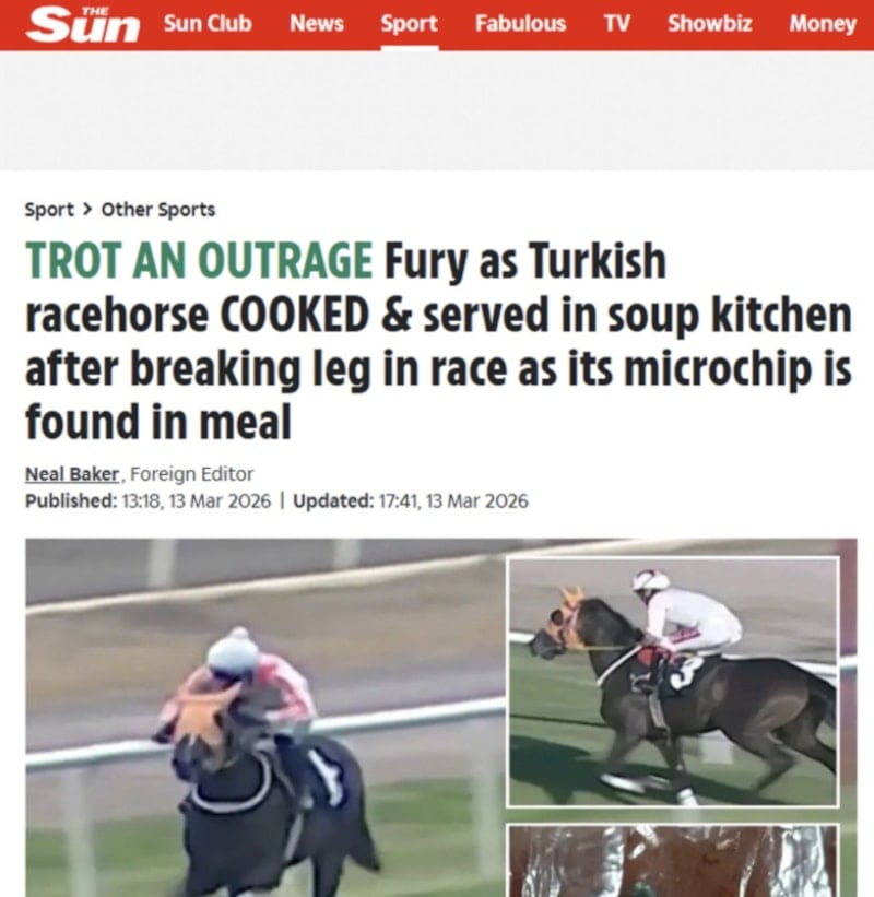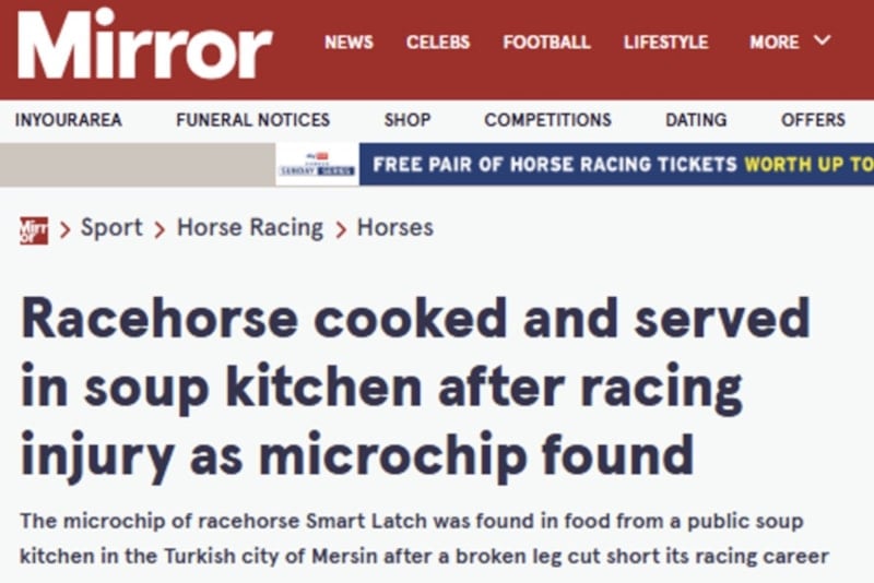 Haberde, “Atının tay sahibi olamayacağını öğrenen Suat, atını çocukların binicilik öğrendiği bir binicilik kulübüne ücretsiz olarak bağışladı. Atı bir sürücüye teslim etti, ancak Smart Latch binicilik okuluna hiç ulaşamadı. Soruşturma, atın kulübe götürülmek yerine yasa dışı bir şekilde kesildiğini gösteriyor. Soruşturmacılar, etin “dana eti” olarak etiketlenerek satıldığını ve sonunda aşevinde kullanıldığını belirtti.” ifadelerine yer verildi.