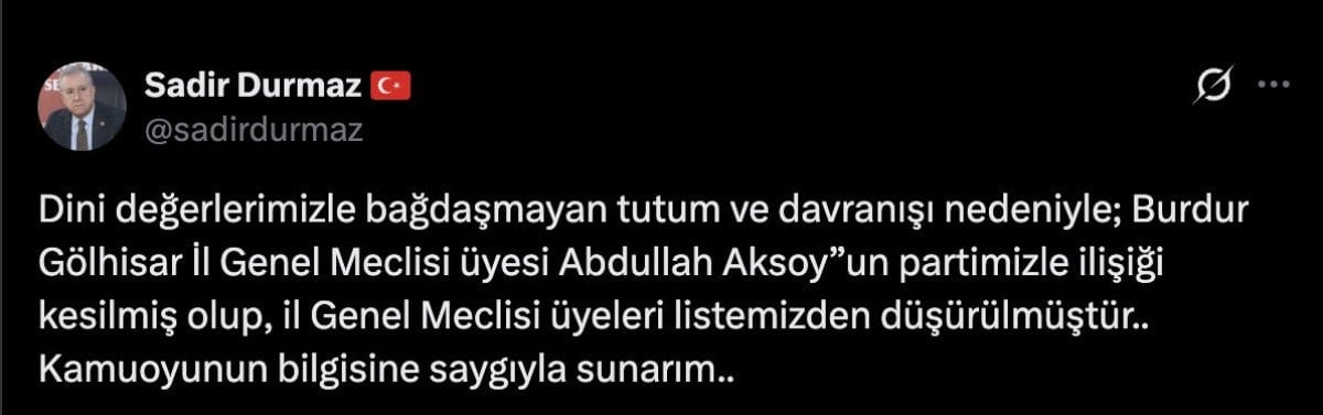 Durmaz, açıklamasında “Dini değerlerimizle bağdaşmayan tutum ve davranışı nedeniyle; Burdur Gölhisar İl Genel Meclisi üyesi Abdullah Aksoy”un partimizle ilişiği kesilmiş olup, il Genel Meclisi üyeleri listemizden düşürülmüştür.