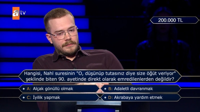 İzmir’den katılan 24 yaşındaki Fatihcan Kalender, 200 bin TL değerindeki soruda Kur’an-ı Kerim’in “en kapsamlı ayeti” olarak bilinen Nahl Suresi 90. ayet üzerinden ter döktü.