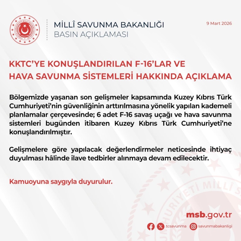 “Bölgemizde yaşanan son gelişmeler kapsamında Kuzey Kıbrıs Türk Cumhuriyeti’nin güvenliğinin arttırılmasına yönelik yapılan kademeli planlamalar çerçevesinde; 6 adet F-16 savaş uçağı ve hava savunma sistemleri bugünden itibaren Kuzey Kıbrıs Türk Cumhuriyeti’ne konuşlandırılmıştır.