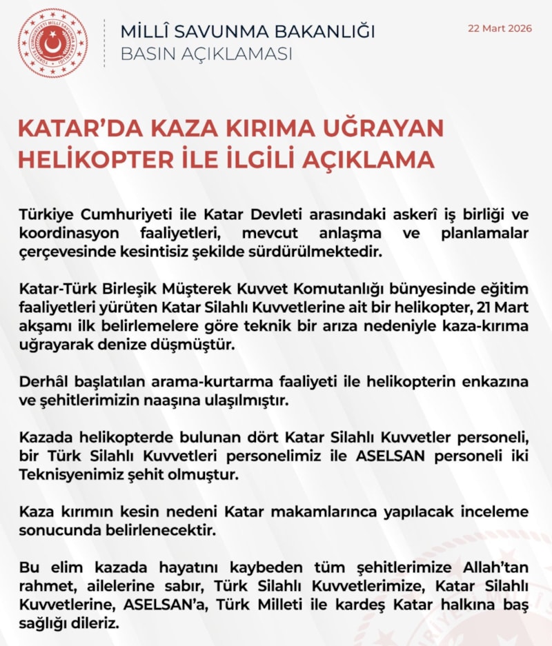 Paylaşılan bilgilendirmede, Katar’da görev yapan askeri helikopterin düşmesi sonucu 1’i Türk Silahlı Kuvvetleri personeli, 2’si ASELSAN çalışanı olmak üzere 7 kişinin şehit olduğunu duyurdu.
