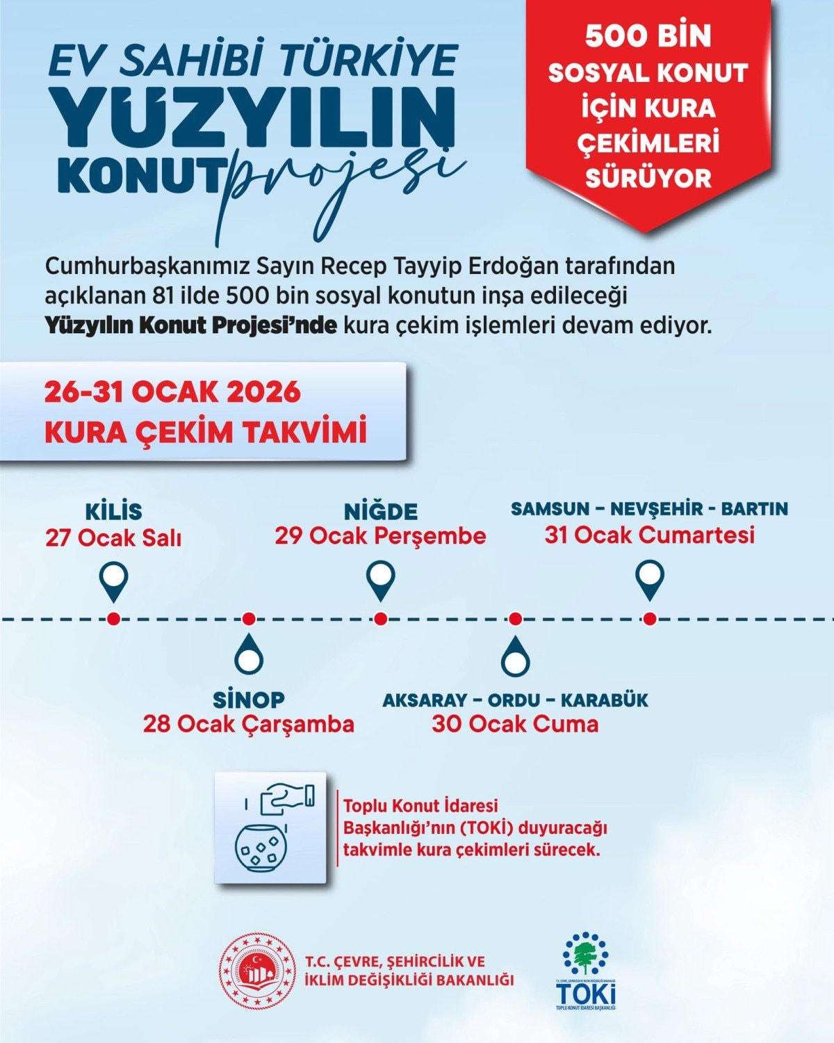 Sosyal medya hesabından 26-31 Ocak kura takvimini paylaşan Çevre, Şehircilik ve İklim Değişikliği Bakanı Murat Kurum, “Milletimize söz verdiğimiz gibi ülkemizin dört bir yanında 500 bin yuvanın anahtarlarının sahiplerini belirlemeye devam ediyoruz.