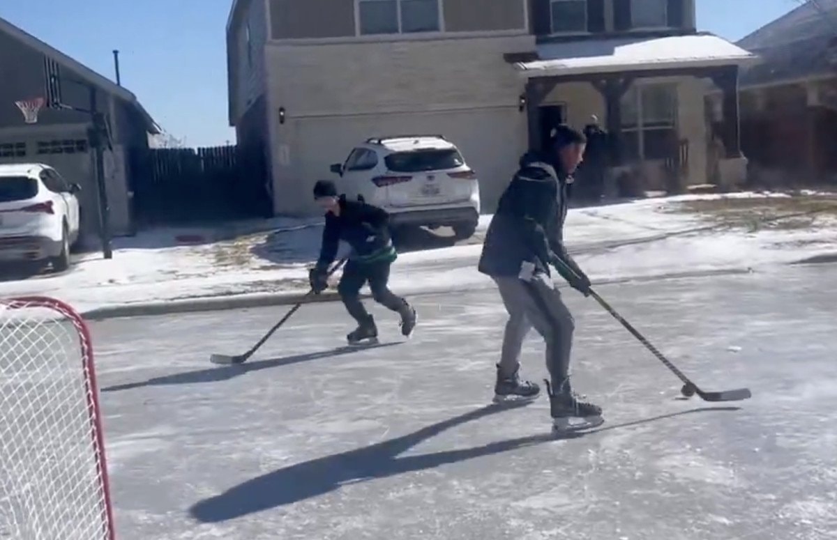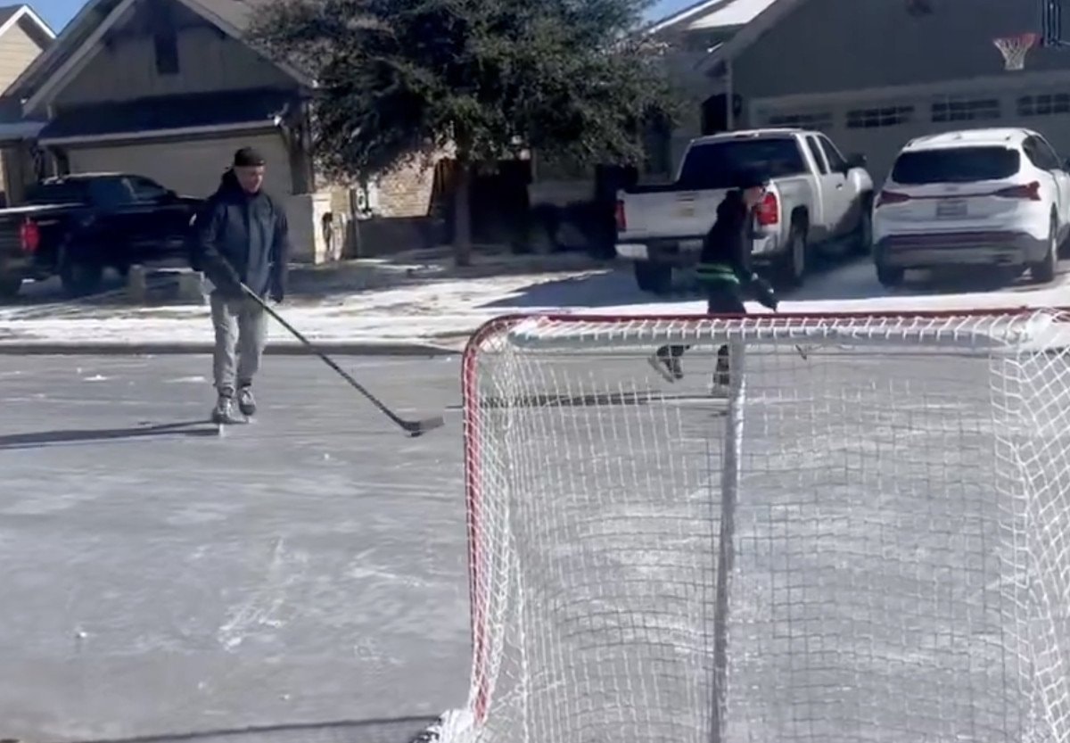 Bu anlardan birinde donmuş sokakta buz hokeyi oynayan baba-oğulun görüntüleri, kameralara yansıdı.