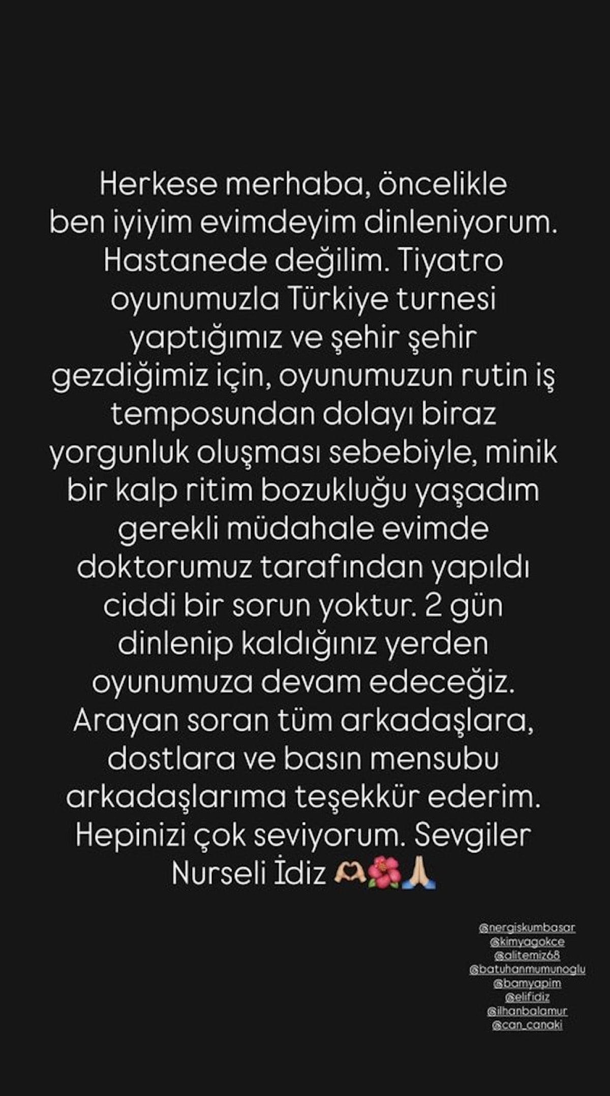 “Herkese merhaba, öncelikle ben iyiyim, evimdeyim dinleniyorum. Hastanede değilim. Tiyatro oyunumuzla Türkiye turnesi yaptığımız ve şehir şehir gezdiğimiz için, oyunumuzun rutin iş temposundan dolayı biraz yorgunluk oluşması sebebiyle minik bir kalp ritim bozukluğu yaşadım. Gerekli müdahale evimde doktorumuz tarafından yapıldı, ciddi bir sorun yoktur. 2 gün dinlenip kaldığımız yerden oyunumuza devam edeceğiz. Arayan soran tüm arkadaşlara, dostlara ve basın mensubu arkadaşlara çok teşekkür ederim. Hepinizi çok seviyorum. Sevgiler.”