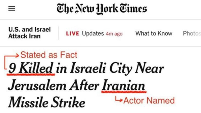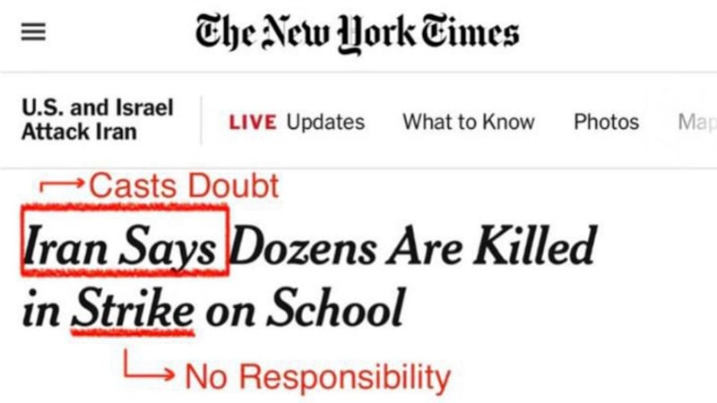 NYT’nin haberi sunuş biçiminde “İran’a göre bir saldırıda onlarca öğrenci öldü” denilerek sanki saldırı herhangi bir bilinmeyenden gelmiş gibi davranıldı.