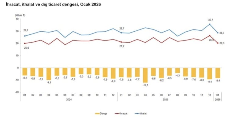 Ocak ayında dış ticaret açığı bir önceki yılın aynı ayına göre yüzde 11,6 artarak 7 milyar 511 milyon dolardan, 8 milyar 380 milyon dolara yükseldi. İhracatın ithalatı karşılama oranı 2025 Ocak ayında yüzde 73,8 iken, 2026 Ocak ayında yüzde 70,8’e geriledi.