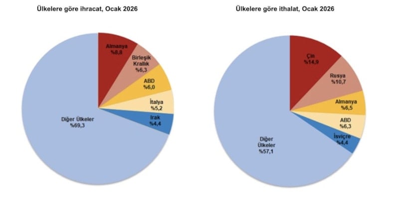 İthalatta Çin ilk sırayı aldı. Ocak ayında Çin’den yapılan ithalat 4 milyar 283 milyon dolar olurken, bu ülkeyi sırasıyla; 3 milyar 78 milyon dolar ile Rusya Federasyonu, 1 milyar 870 milyon dolar ile Almanya, 1 milyar 812 milyon dolar ile ABD, 1 milyar 273 milyon dolar ile İsviçre izledi. İlk 5 ülkeden yapılan ithalat, toplam ithalatın yüzde 42,9’unu oluşturdu.