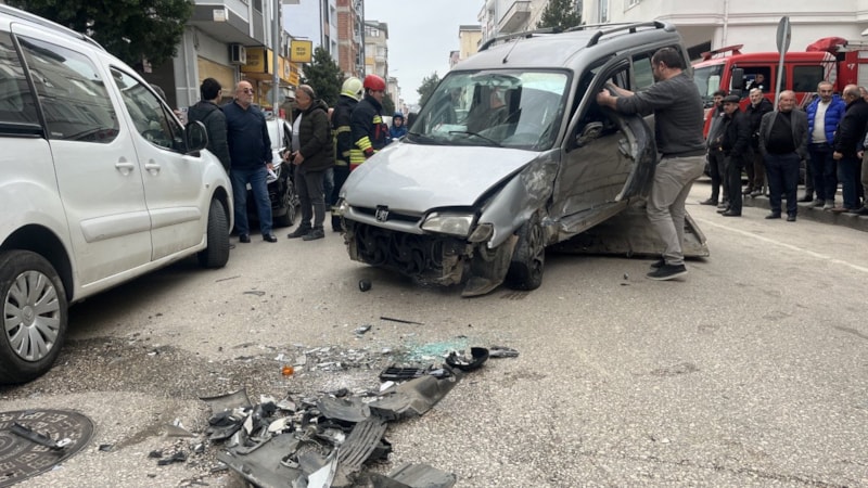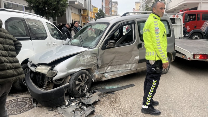 Çarpışmanın etkisiyle savrulan hafif ticari araç, cadde üzerindeki park halindeki 2 otomobile çarparak maddi hasara yol açtı.