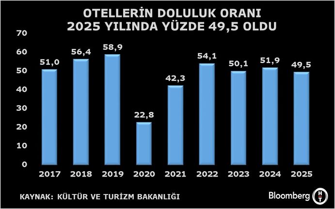 Kültür ve Turizm Bakanlığı verilerine göre 2024 yılında yıllık bazda yüzde 51,91 olan otellerdeki doluluk oranı 2025 yılında yüzde 49,54’e geriledi.