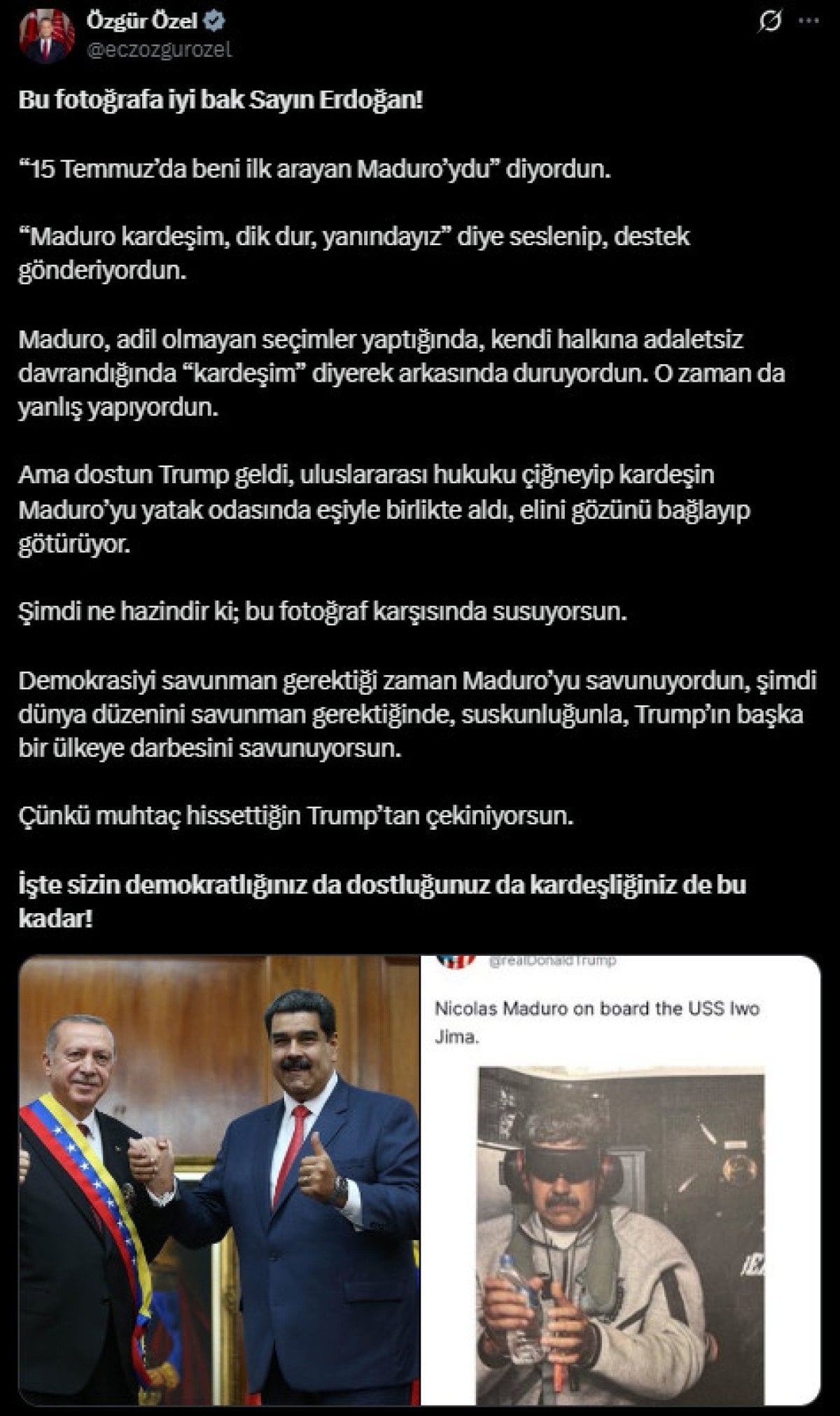 Cumhuriyet Halk Partisi Genel Başkanı Özgür Özel, Venezuela Devlet Başkanı Nicolas Maduro’nun ABD tarafından iktidardan indirilmesiyle ilgili paylaşım yaparak Cumhurbaşkanı Recep Tayyip Erdoğan ile Maduro’nun fotoğrafı üzerinden Erdoğan’ı eleştirdi.