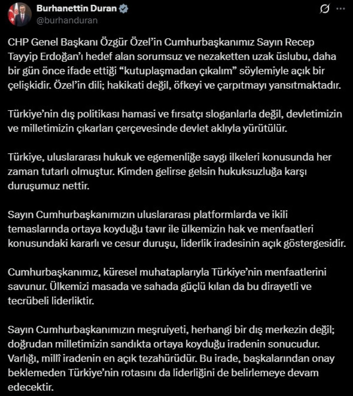 Duran, yaptığı paylaşımda Özel’in Erdoğan’a yönelik ifadelerini eleştirerek şöyle devam etti: