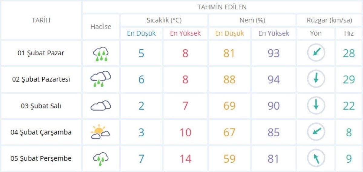 Havanın pazartesi günü çok bulutlu, aralıklarla yağmur ve sağanak yağışlı olacağı, yağışların yerel olarak kuvvetli, en düşük sıcaklığın 6, en yüksek sıcaklığın 8 derece olmasının beklendiği aktarılan açıklamada salı günü parçalı ve çok bulutlu, en düşük sıcaklığın 2, en yüksek sıcaklığın ise 7 derece olabileceği belirtildi.