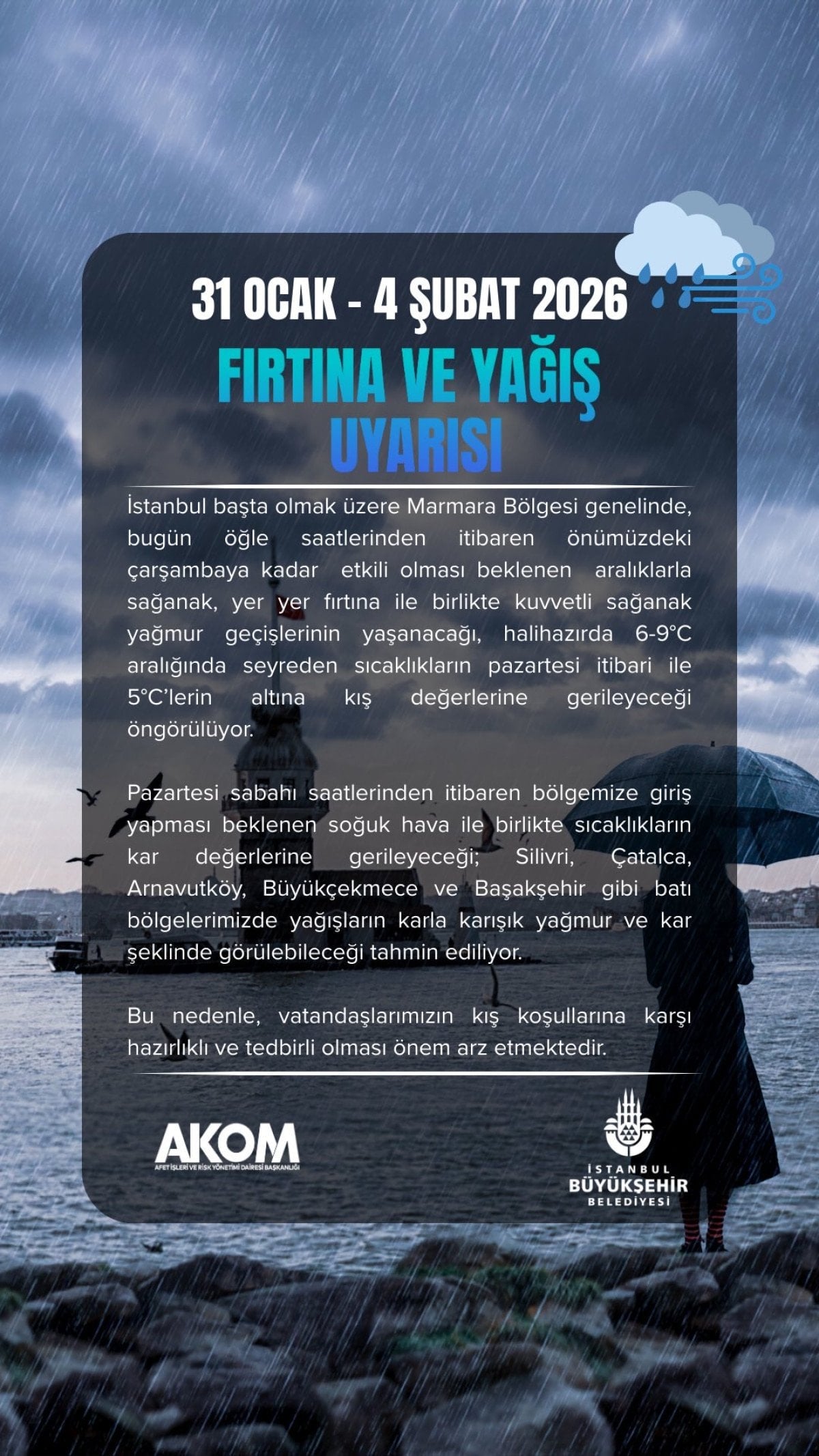 İstanbul Büyükşehir Belediyesi Afet Koordinasyon Merkezi’nden yapılan açıklamaya göre İstanbul başta olmak üzere Marmara Bölgesi genelinde 4 Şubat Çarşamba gününe kadar aralıklarla sağanak, yer yer fırtına ile birlikte kuvvetli sağanak geçişlerinin yaşanacağı öngörülüyor.