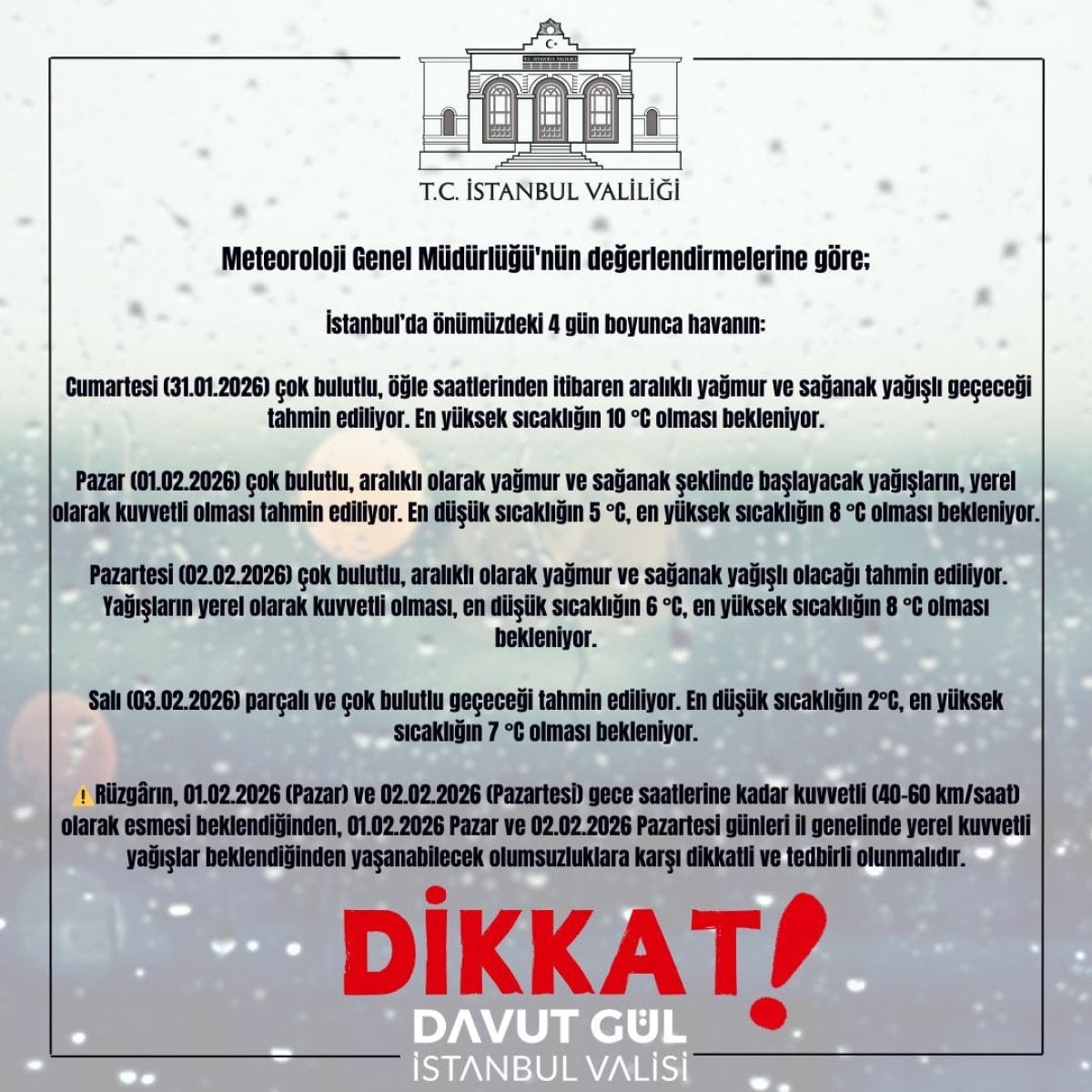 İstanbul Valiliği’nden yapılan açıklamada Meteoroloji Genel Müdürlüğü’nün yaptığı son değerlendirmelere göre pazar gününden itibaren çok bulutlu, aralıklarla yağmur ve sağanak yağışların yerel olarak kuvvetli, en düşük sıcaklığın 5, en yüksek sıcaklığın 8 derece olmasının beklendiği kaydedildi.
