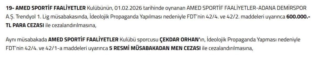 PFDK, ideolojik propaganda yapılması nedeniyle Çekdar’a 5 maç men cezası verildiğini duyurdu.