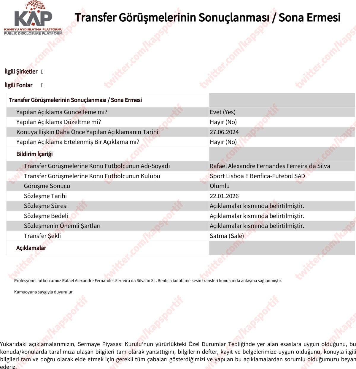 Siyah-beyazlı kulüpten transferle ilgili Kamuyu Aydınlatma Platformu’na (KAP) yapılan açıklamada, “Profesyonel futbolcumuz Rafael Alexandre Fernandes Ferreira da Silva’nın SL Benfica kulübüne kesin transferi konusunda anlaşma sağlanmıştır” denildi.