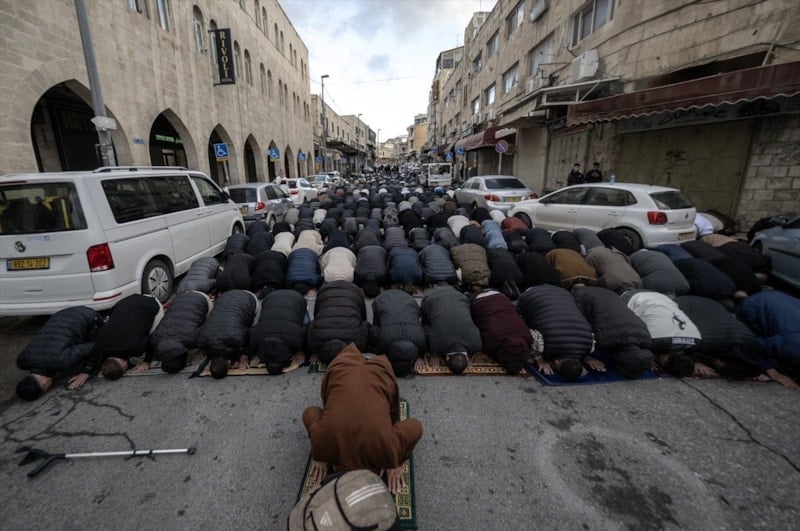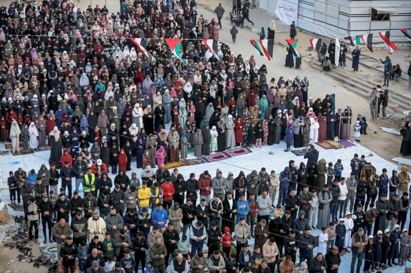 Bayramı namazını İsrail saldırılarında yıkılan İbn Taymiyye Camisi’nin enkazının çevresinde kıldı.