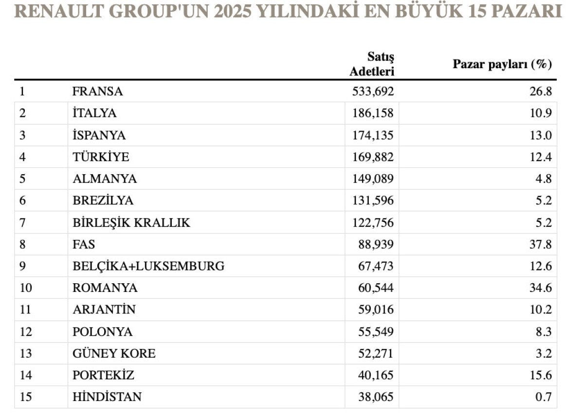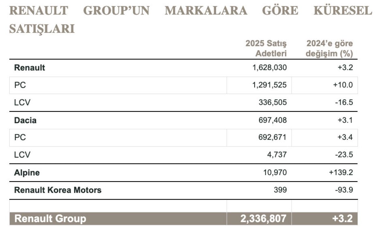 Avrupa dışı pazarlarda Renault markası yüzde 11,7 büyüdü. Latin Amerika, Güney Kore ve Fas’taki güçlü artışlar, Grubun küresel satış performansını destekledi. Bu sonuçla Renault, dünyanın en çok satan Fransız otomobil markası olma unvanını korudu.