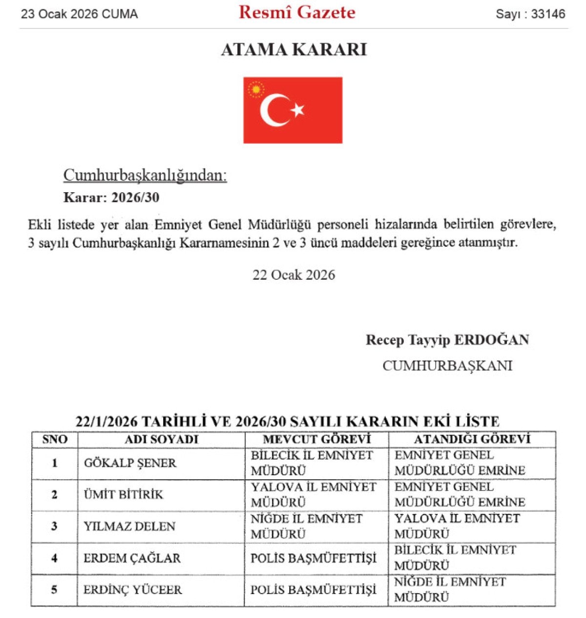 Resmi Gazete’de yayımlanan kararla Bilecik, Yalova ve Niğde’de emniyet müdürleri değişti.