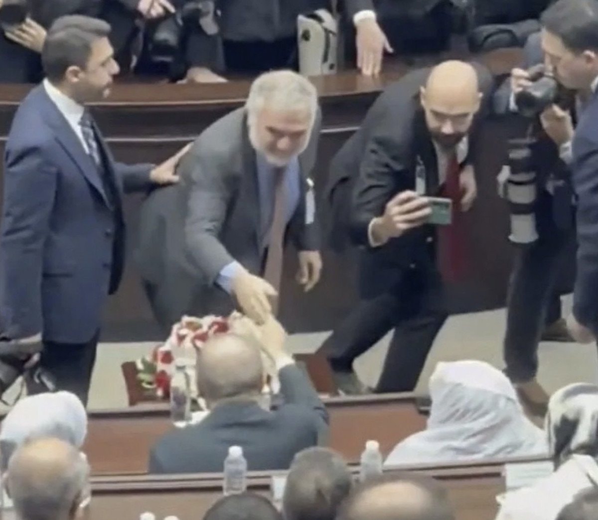Ruşen Çakır’ın Cumhurbaşkanı Erdoğan’la tokalaştığı anlar, grup toplantısının en dikkati çeken karelerinden oldu.