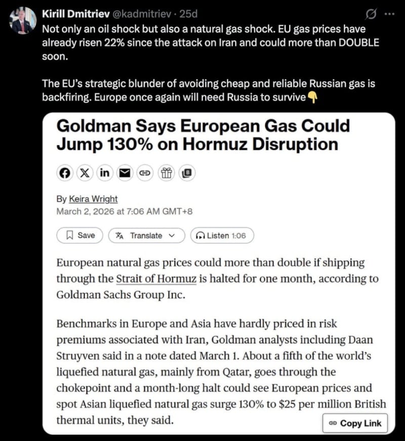 Rusya Doğrudan Yatırım Fonu Başkanı da olan Dmitriyev paylaşımında, Goldman Sachs’in Avrupa’daki doğal gaz fiyatlarının yüzde 130 artabileceğine yönelik raporunu alıntılayarak “Sadece bir petrol şoku değil, aynı zamanda bir doğal gaz şoku.” ifadelerine yer verdi.