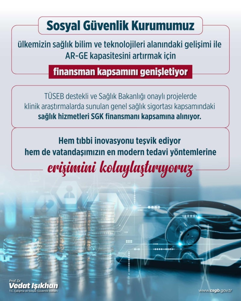 Buna göre TÜSEB destekli ve Sağlık Bakanlığı onaylı projelerde klinik araştırmalarda sunulan genel sağlık sigortası kapsamındaki sağlık hizmetleri SGK finansmanı kapsamına alınıyor.