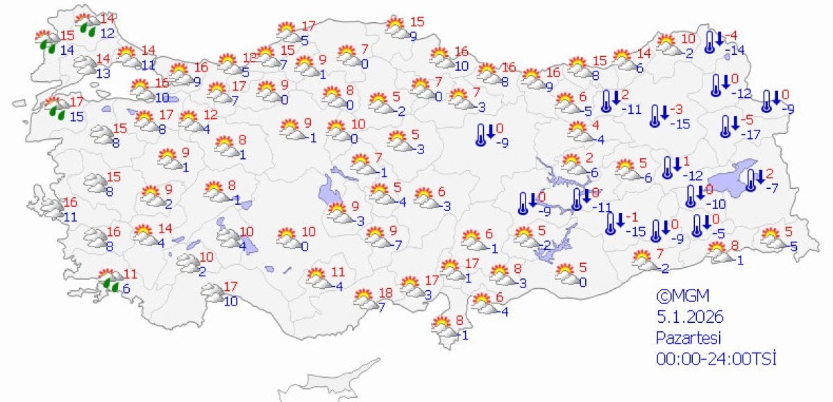 Batı illerde 15-19 derece, iç Anadolu 11-14 derece ve doğuda hafif yükselişle 0-5 derece sıcaklıklar bekleniyor.