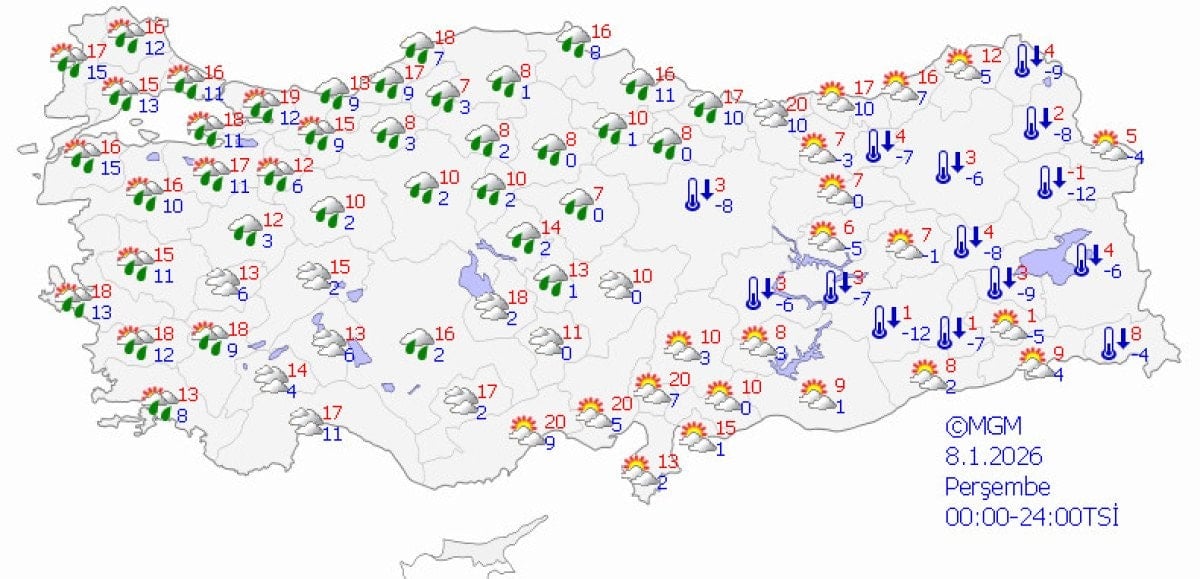 Perşembe günü, kıyılarda 17-20 derece, iç kesimlerde 12-18 derece ve doğu Anadolu’da bile 0-10 dereceye yaklaşan sıcaklık değerleri öngörülüyor.