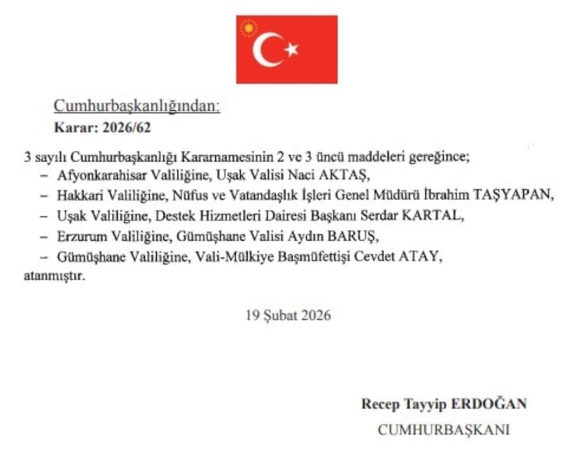 Cumhurbaşkanlığı kararıyla Afyonkarahisar, Uşak, Hakkari, Erzurum ve Gümüşhane valiliklerine yeni atamalar yapılarak 5 ilin valisi değişti.