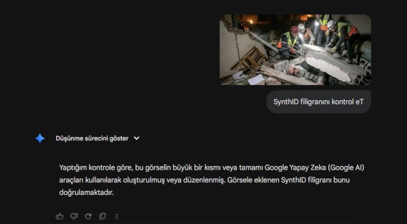 Son olarak Google, kendi yapay zekaları ile üretilen içeriklere gizli bir filigran ekliyor. Google Gemini’yi açın ve fotoğrafı yükledikten sonra şunu yazın: “SynthID filigranını kontrol et.”  Google  size bu görselin yapay zeka ile üretilip üretilmediğini söyleyecektir.