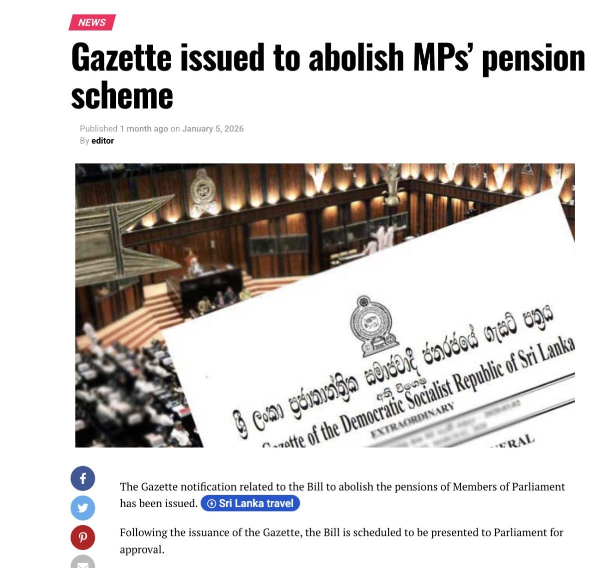 Sri Lanka’da, bir milletvekili daha önce 5 yıllık görev süresinin ardından emekli maaşı almaya hak kazanıyordu. Yeni yasa, halihazırda emekli maaşı alan veya almaya hak kazanan herkese ödeme yapılmasını durduruyor. 2024’te göreve gelen Cumhurbaşkanı Anura Kumara Dissanayake, seçim kampanyası sırasında bu uygulamaya son vereceğine söz vermişti.
