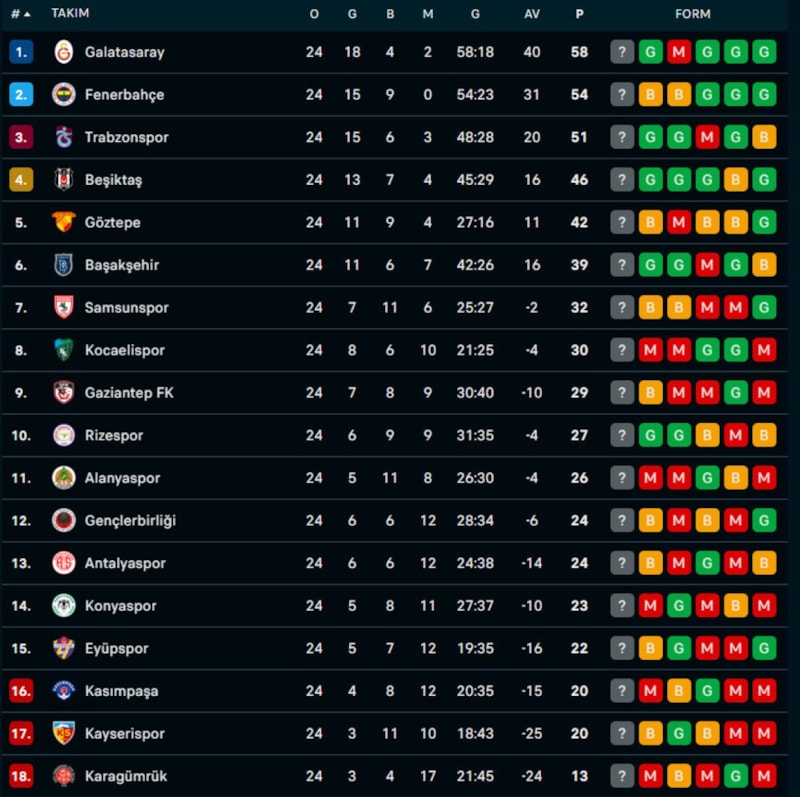Süper Lig’in 24. haftasında oynanan maçlar ve alınan sonuçlar şöyle: