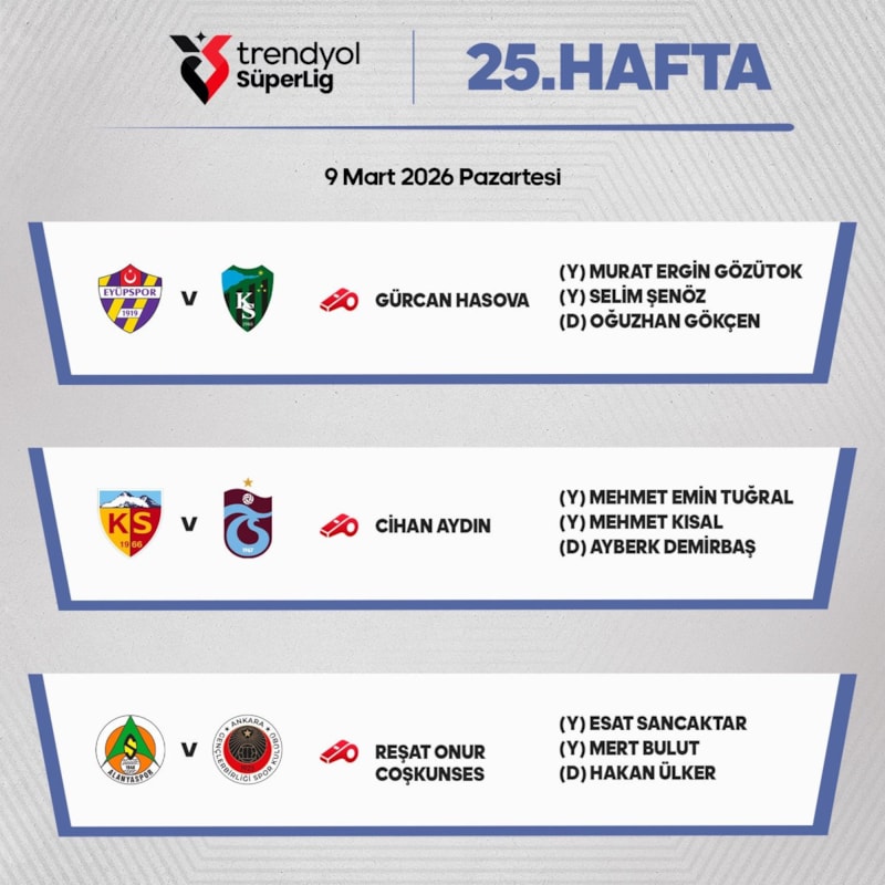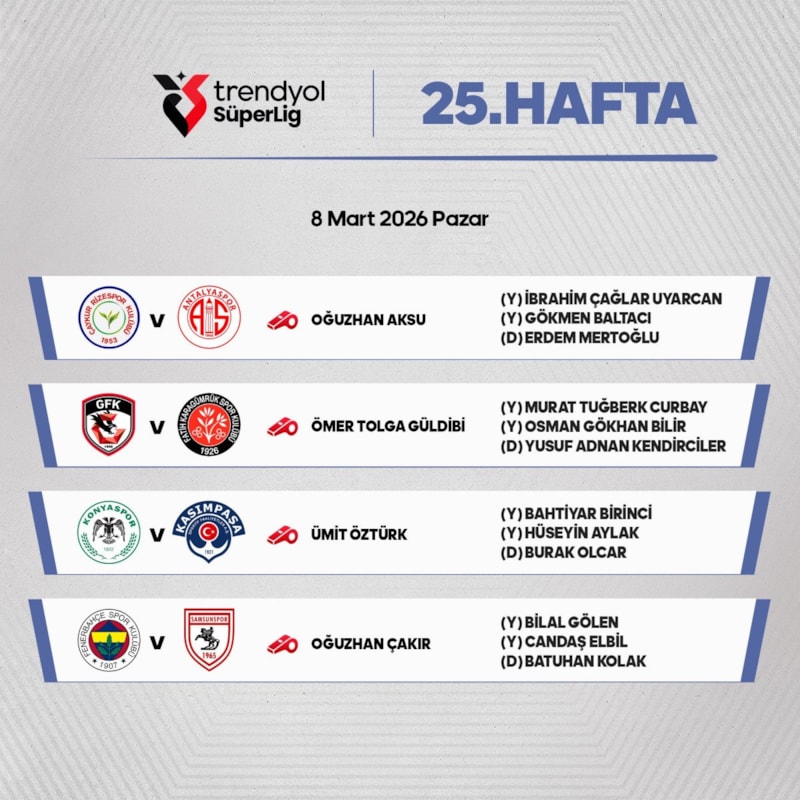 Merkez Hakem Kurulu, Süper Lig’de 25. haftada görev yapacak hakemleri duyurdu.