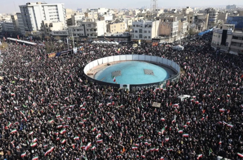 Siyah yas kıyafetleri içindeki halk, İran bayrakları ve pankartlar sallarken, havadan çekilen fotoğraflarda binlerce kişinin bir araya geldiği görüldü.