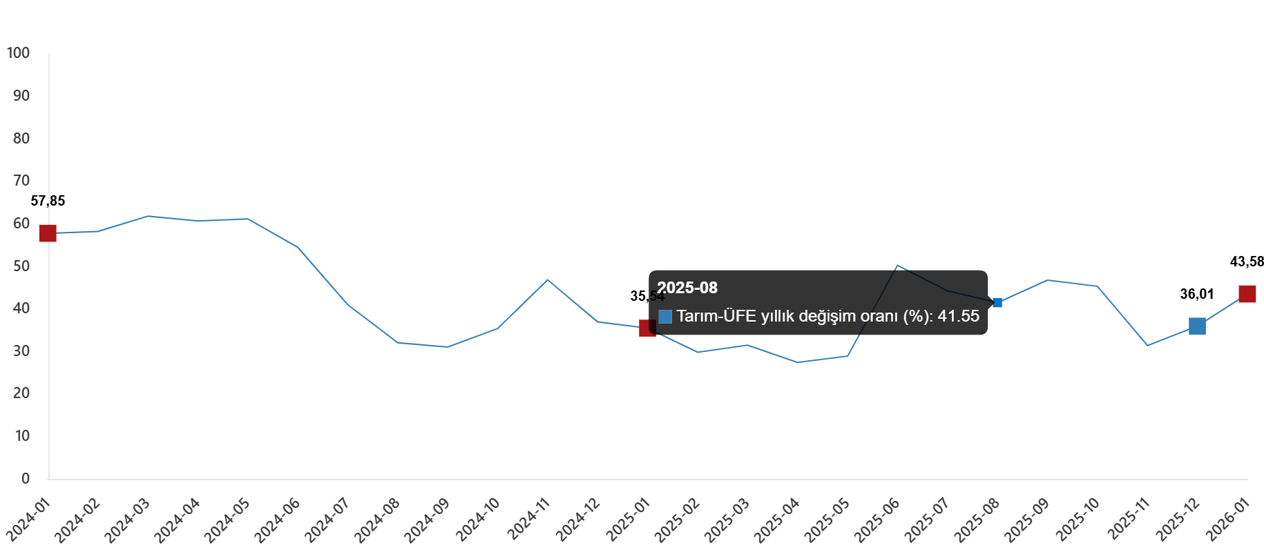 Tarım ürünleri üretici fiyat endeksi (Tarım-ÜFE) yıllık %43,58 arttı, aylık %8,46 arttı