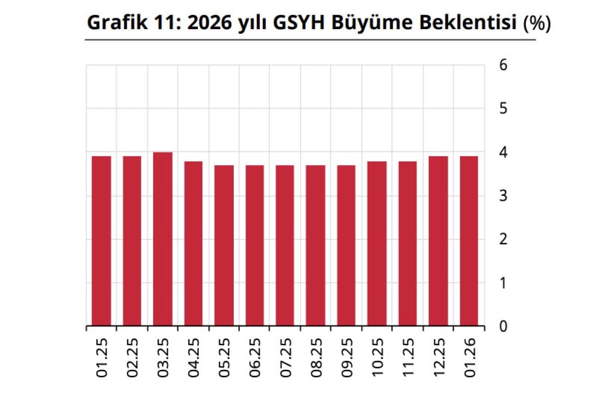 Katılımcıların GSYH 2026 yılı büyüme beklentisi bir önceki anket döneminde olduğu gibi bu anket döneminde de yüzde 3,9 olarak gerçekleşti. GSYH 2027 yılı büyüme beklentisi bu anket döneminde yüzde 4,3 oldu.