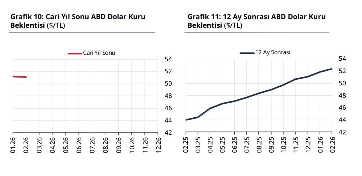 Katılımcıların cari yıl sonu döviz kuru (ABD Doları/TL) beklentisi bir önceki anket döneminde 51,17 TL iken, bu anket döneminde 51,09 TL oldu. 12 ay sonrası döviz kuru beklentisi ise bir önceki anket döneminde 51,89 TL iken, bu anket döneminde 52,39 TL olarak gerçekleşti.