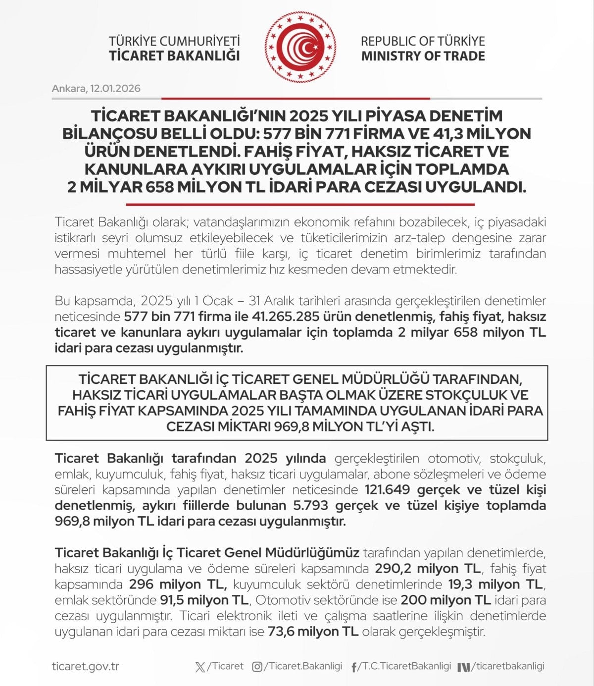 Vatandaşların ekonomik refahını bozabilecek, iç piyasadaki istikrarlı seyri olumsuz etkileyebilecek ve tüketicilerin arz-talep dengesine zarar vermesi muhtemel her türlü fiile karşı, iç ticaret birimlerince yürütülen denetimlerin devam ettiği belirtilen açıklamada, “Bu kapsamda, 2025 yılı 1 Ocak-31 Aralık tarihlerinde 577 bin 771 firma ile 41 milyon 265 bin 285 ürün denetlendi. Fahiş fiyat, haksız ticaret ve kanunlara aykırı uygulamalar için 2 milyar 658 milyon lira idari para cezası uygulandı.” ifadeleri kullanıldı.