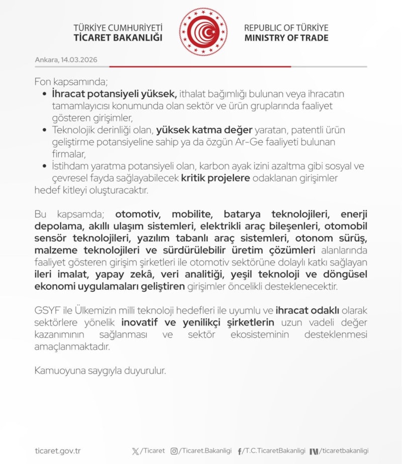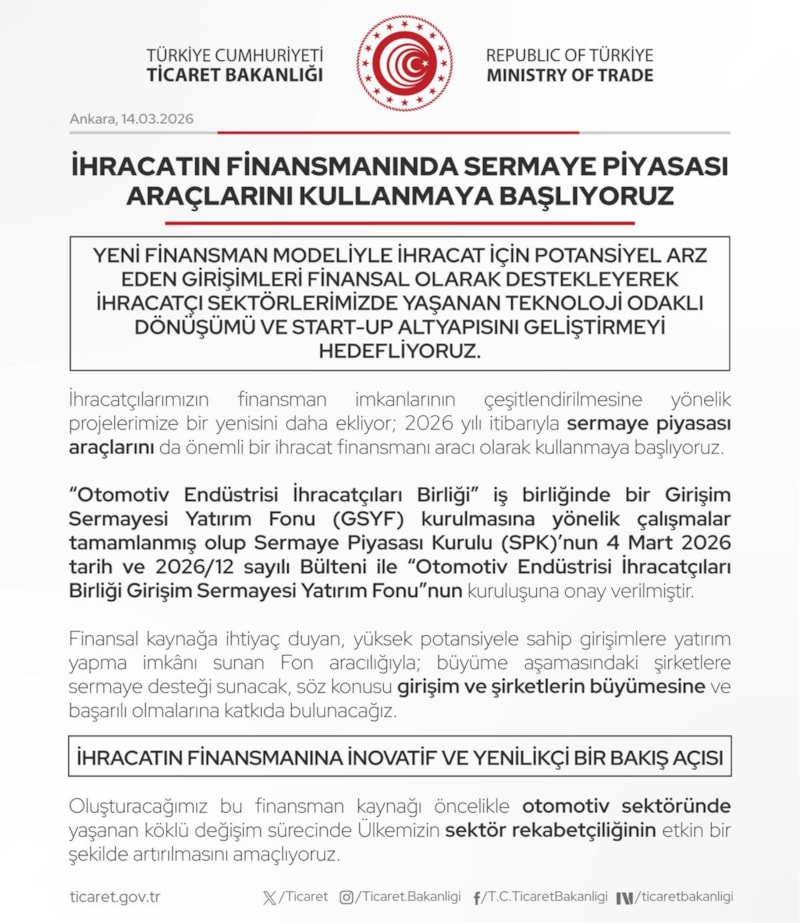 Bu kapsamda Otomotiv Endüstrisi İhracatçıları Birliği iş birliğiyle bir Girişim Sermayesi Yatırım Fonu (GSYF) kurulmasına yönelik çalışmalar tamamlandı. Kurulan fon, Sermaye Piyasası Kurulunun 4 Mart 2026 tarihli ve 2026/12 sayılı bülteni ile onay aldı.