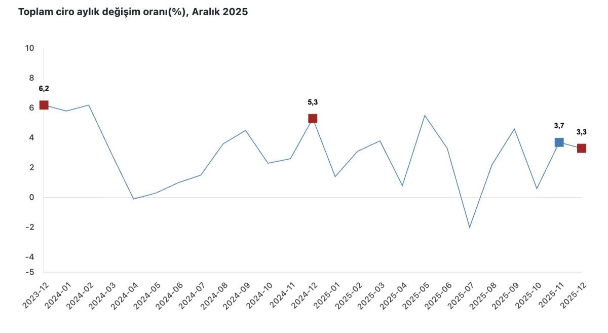 Buna göre, mevsim ve takvim etkisinden arındırılmış toplam ciro endeksi, Aralık 2025’te aylık bazda yüzde 3,3 arttı.