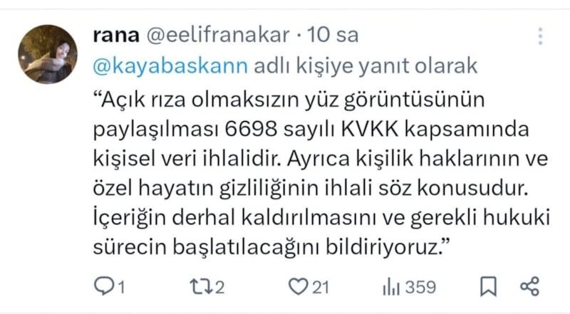 Genç kızın yakınları, “Siz bunu izinsiz paylaştınız. Biz de susmayacağız”, “Açık rıza olmaksızın görüntüsünün paylaşılması 6698 sayılı KVKK kapsamında kişisel veri ihlalidir. Kişilik haklarının ve özel hayatın gizliliğinin ihlali söz konusudur. İçeriğin derhal kaldırılmasını ve gerekli hukuki sürecin başlatılacağını bildiriyoruz” diyerek tepkilerini dile getirdi.