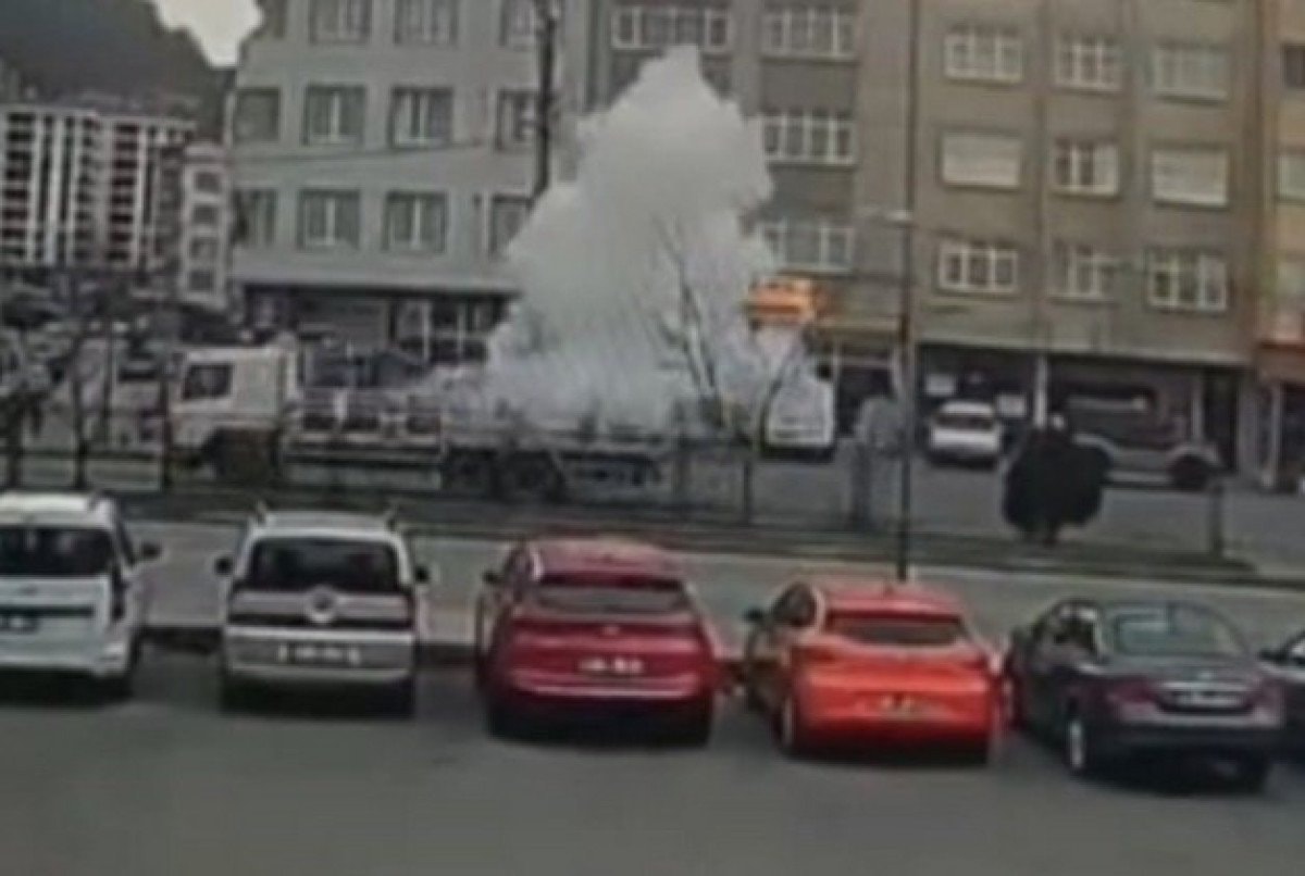Bugün öğle saatlerinde Trabzon’un Sürmene ilçe merkezinde, henüz bilinmeyen bir nedenle kamyon kasasında bulunan tüplerden biri aniden patladı. Şiddetli patlamanın ardından metal ve tüp parçaları çevreye saçılırken, o sırada yolun yan şeridinde seyreden bir otobüsün üzerine parçalar düştü. Yaşananlar, çevredeki bir iş yerinin güvenlik kamerası tarafından saniye saniye kaydedildi.