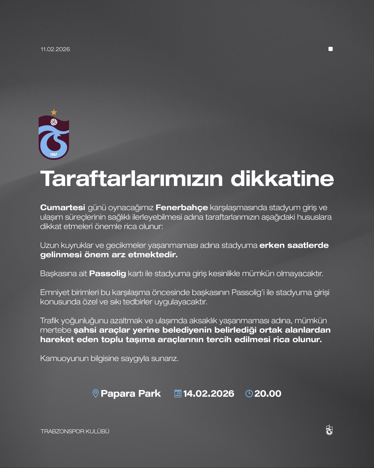 Uzun kuyruklar ve gecikmeler yaşanmaması adına stadyuma erken saatlerde gelinmesi önem arz etmektedir. Başkasına ait Passolig kartı ile stadyuma giriş kesinlikle mümkün olmayacaktır. Emniyet birimleri bu karşılaşma öncesinde başkasının Passolig’i ile stadyuma girişi konusunda özel ve sıkı tedbirler uygulayacaktır. Trafik yoğunluğunu azaltmak ve ulaşımda aksaklık yaşanmaması adına mümkün mertebe şahsi araçlar yerine belediyenin belirlediği ortak alanlardan hareket eden toplu taşıma araçlarının tercih edilmesi rica olunur.