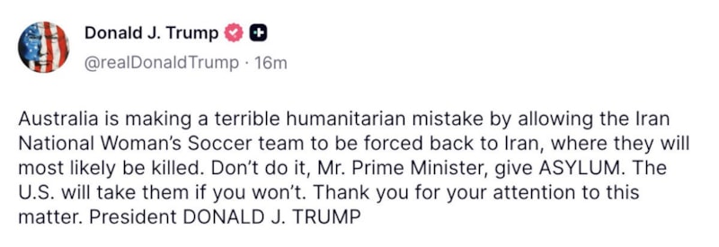 Trump’tan Avustralya’ya mesaj: İran Kadın Milli Futbol Takımı’na iltica hakkı tanıyın